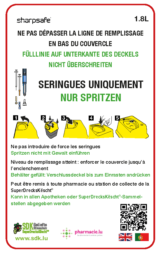 Nutzen Sie die Sicherheitsbox, die speziell für Spritzen und Kanülen aus Privathaushalten von der SDK in Zusammenarbeit mit Ärzten und Apotheken eingeführt wurde und in allen Apotheken und bei der SuperDrecksKëscht® auf Anfrage kostenlos erhältlich ist. Es gibt sie in der 2 l Grösse.